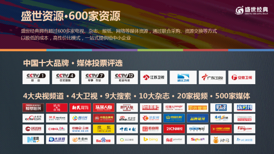 作為一家為企業(yè)提供創(chuàng)造性品牌整合營銷解決方案的專業(yè)品牌策劃機(jī)構(gòu),盛世經(jīng)典整合央視CCTV-1、CCTV-2、CCTV-3等12個(gè)頻道;湖南衛(wèi)視、重慶衛(wèi)視、浙江衛(wèi)視等20多家地方衛(wèi)視頻道;百度、360、搜狗等9大搜索引擎;《環(huán)球人物》、《中國企業(yè)家》、《財(cái)經(jīng)國家周刊》等10多家紙質(zhì)媒體;騰訊視頻、愛奇藝、優(yōu)酷網(wǎng)等50多家視頻網(wǎng)站;《新浪家居》、《騰訊家居》、《今日頭條》、《搜狐網(wǎng)》等500多家網(wǎng)絡(luò)媒體;抖音、快手、映客等新媒體主流平臺,通過聯(lián)合采購、資源交換等方式,以極低的成本、高性價(jià)比的模式,助力企業(yè)輕松實(shí)現(xiàn)“企業(yè)形象瞬間提升70%”的目標(biāo)。
